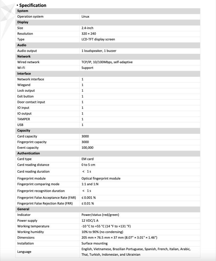 - 3,000 fingerprints, 3,000 cards and 100,000 events storage